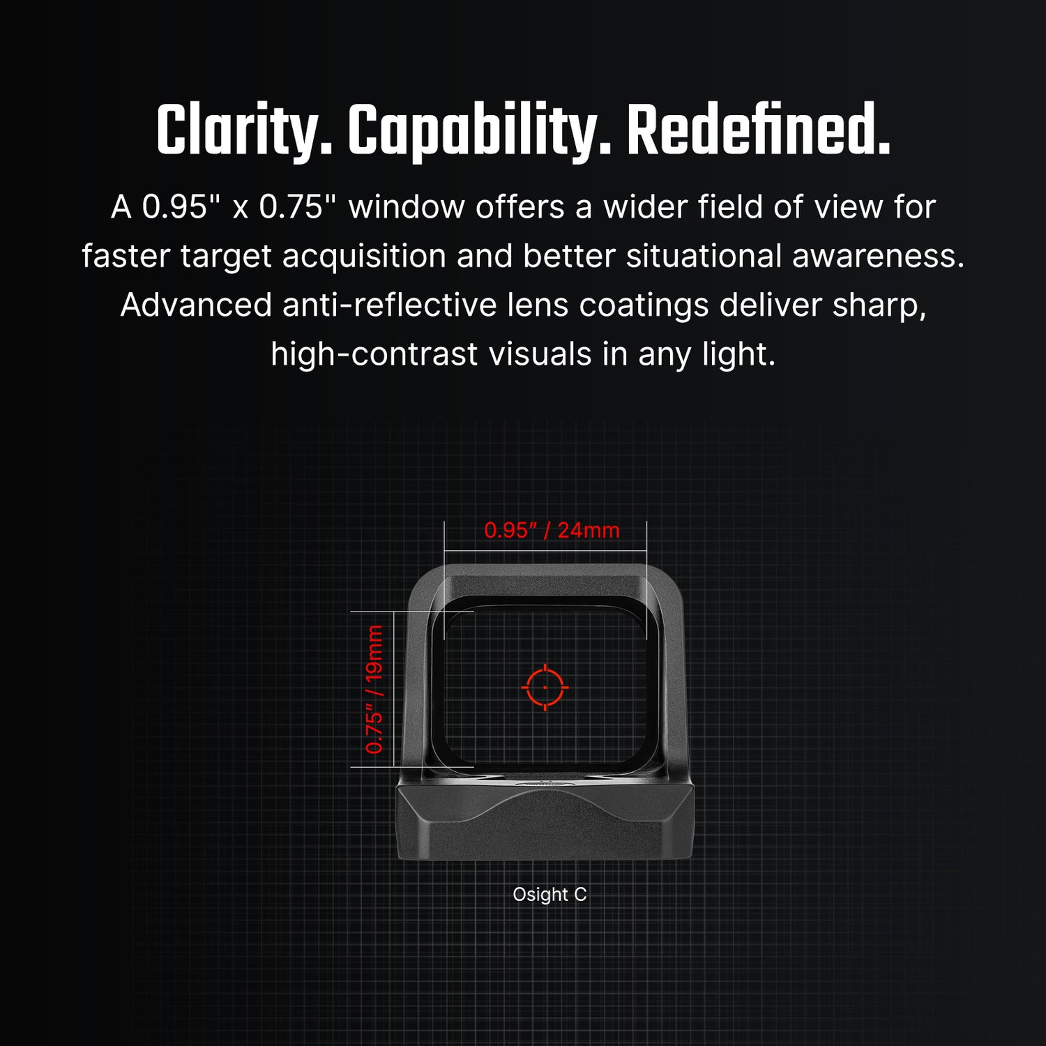 Osight C stawia klarowność, szybkość i pewność w centrum każdego strzału. Jasne, szerokie okno widokowe przyspiesza obraz celownika, dzięki czemu cele pojawiają się natychmiast. Zmieniaj siatki celownicze, aby dopasować się do chwili - od precyzyjnych strzałów po szybkie przejścia - podczas gdy inteligentny czujnik ruchu utrzymuje optic ready gdy ty jesteś i oszczędza energię, gdy nie jesteś. Wymiana baterii to pestka i nie zakłóca twojego zera. A dzięki standardowemu w branży footprint, Osight C pasuje do szerokiej gamy pistoletów i karabinów bez problemów.